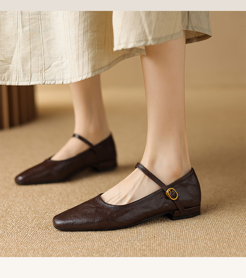 • 2024 Top Layer Sheepskin Flat Leather Shoes For Women Retro Small Square Toe Shallow Mouth Single Shoes One-Strap Mary Jane Shoes