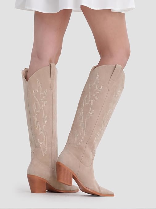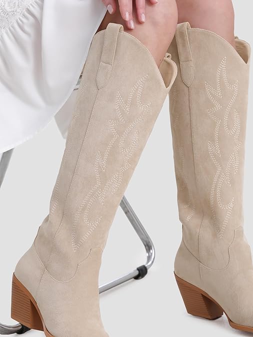 / Cowgirl Boots Women Knee High Boots Pointed Toe And Block Heel Cowboy Suede Boots With Embroidered