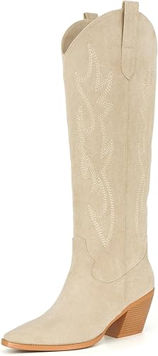 Cowgirl Boots Women Knee High Boots Pointed Toe And Block Heel Cowboy Suede Boots With Embroidered