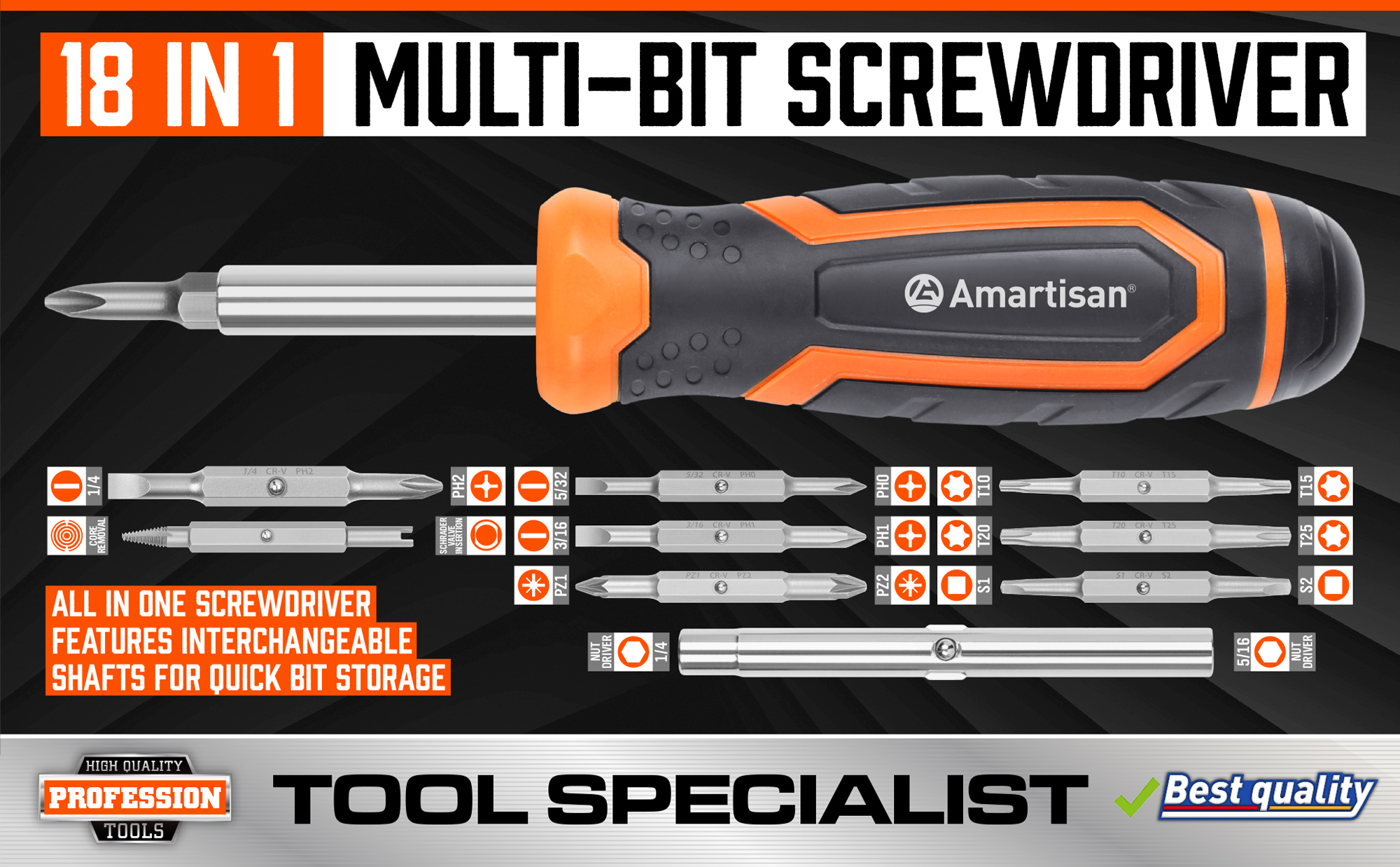 Interchangeable blades for quick and easy switching, suitable for home, car repair, outdoor and other workplaces, no need for extra screwdrivers, a set of 18 in 1 screwdrivers can solve all your problems.