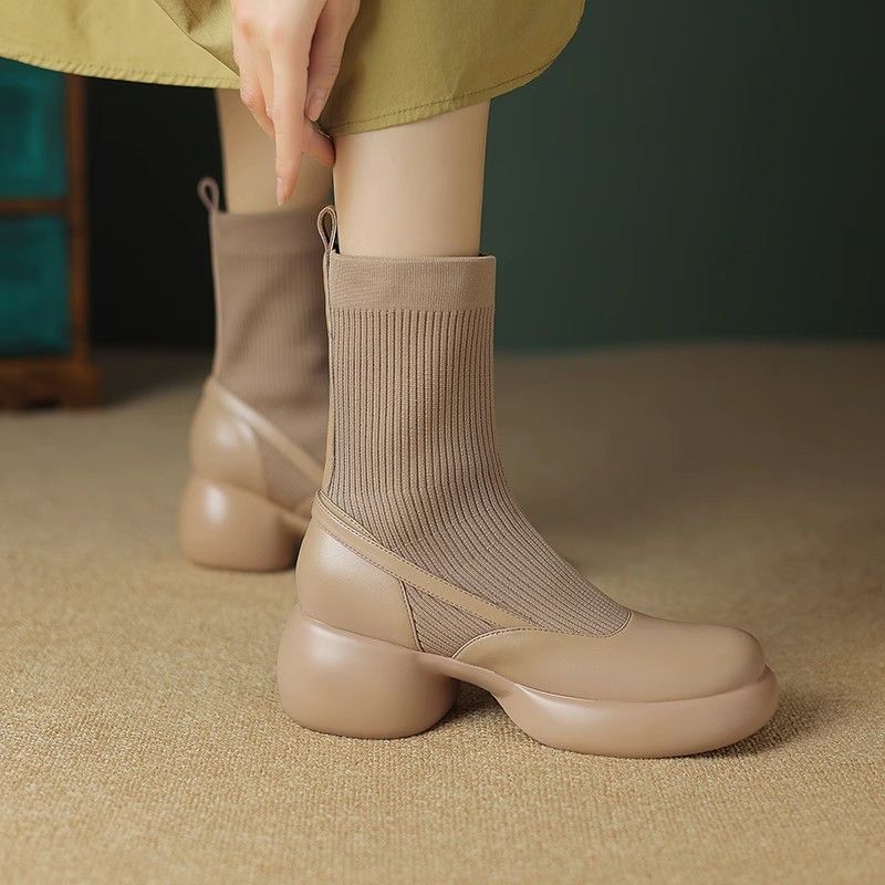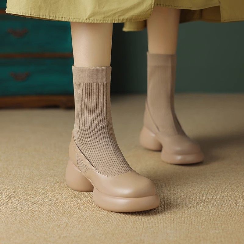 • Thick-Soled Elastic Martin Boots For Women Soft Leather Wool Platform Socks Slim Boots 2024 New Autumn And Winter High-Heeled Short Boots
