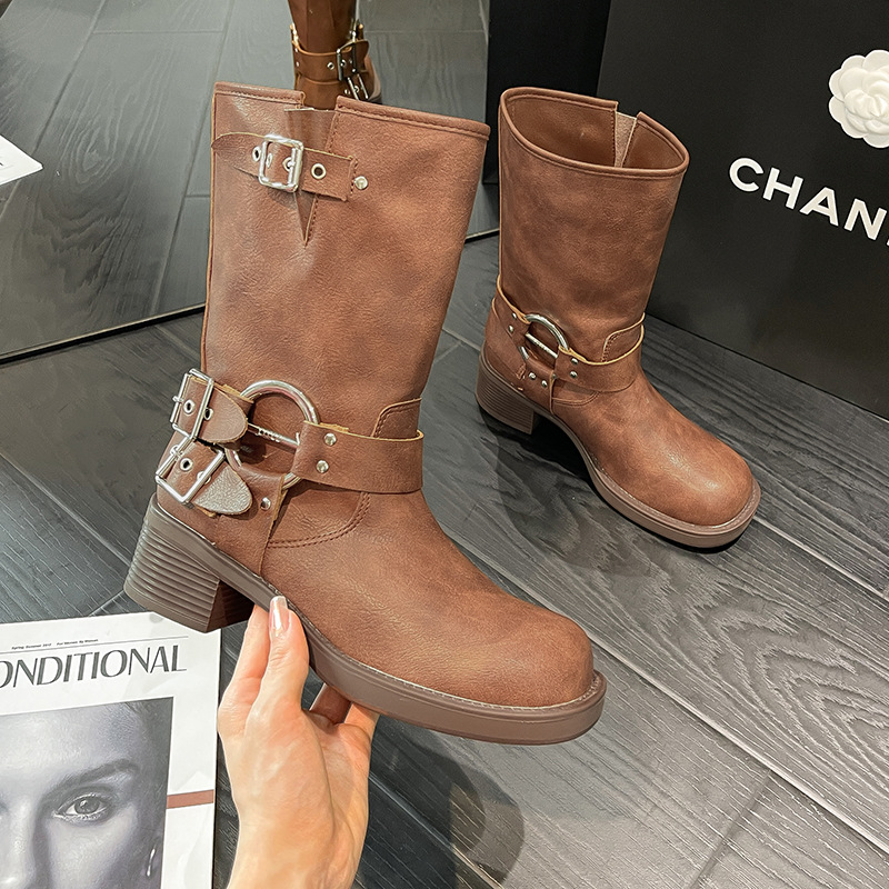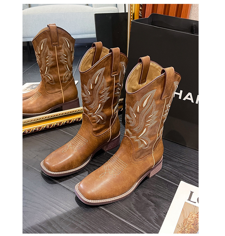• Vintage Embroidered V Martin Boots For Women Summer Brown Thick Heel Boots Internet Celebrity Knight Boots Short Boots Western Cowboy Boots
